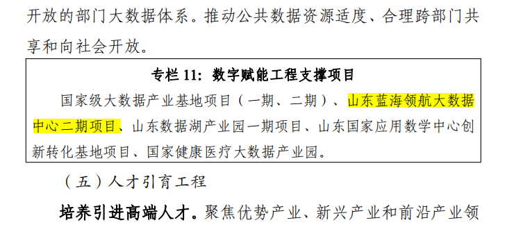 蓝海领航大数据中心二期项目已纳入济南市发改委“十四五”战略性新兴产业发展规划,作为数字化生态的底座支撑。